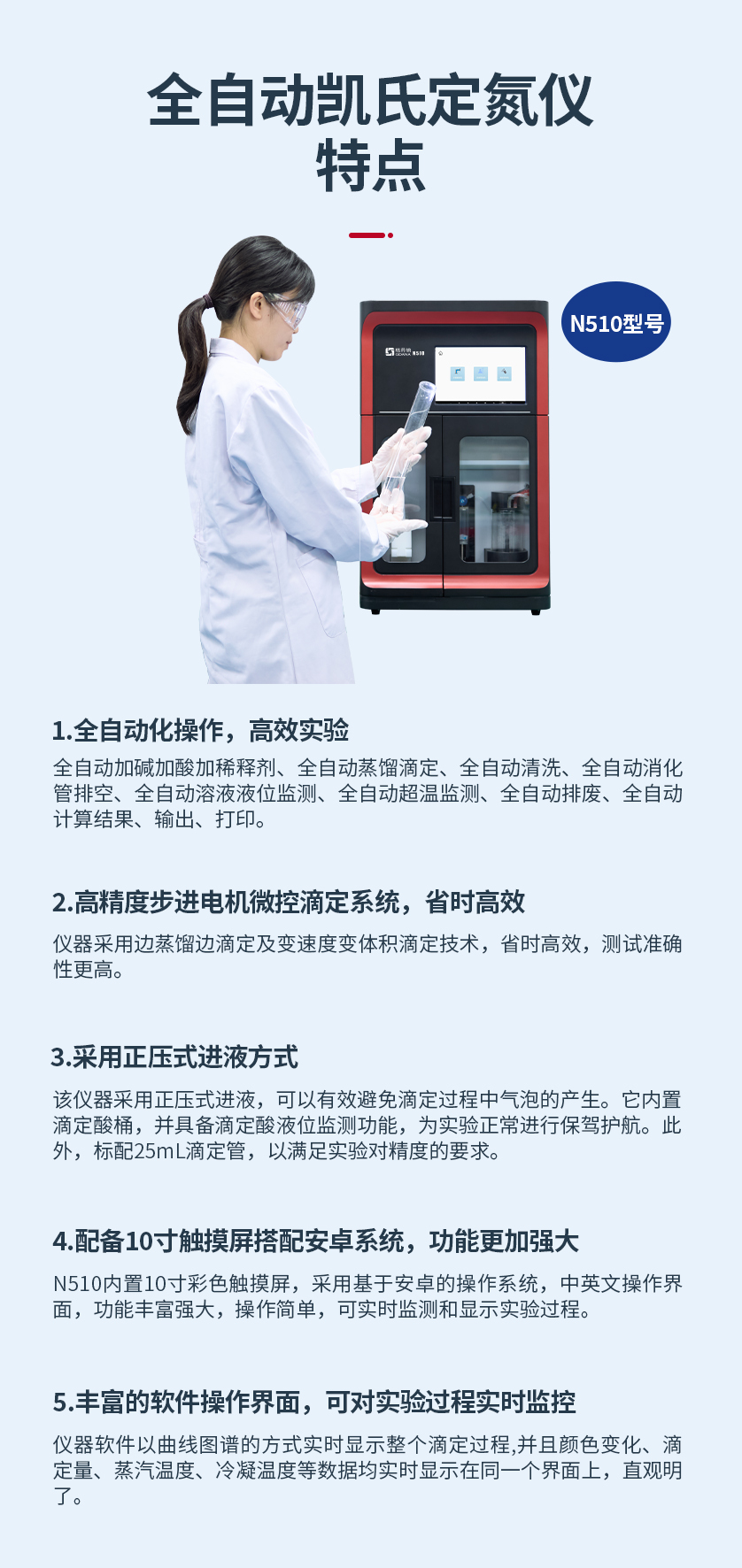 新一代N510全自動凱氏定氮儀集成了自動加堿加酸、自動加稀釋劑、蒸餾滴定、消化管排空、溶液液位監(jiān)測、超溫監(jiān)測、清洗排廢、結果計算等功能。采用符合國家標準的凱氏定氮方法:濃硫酸環(huán)境消解樣品、堿性環(huán)境蒸汽蒸餾、硼酸吸收、加指示劑滴定、終點顏色判定法。