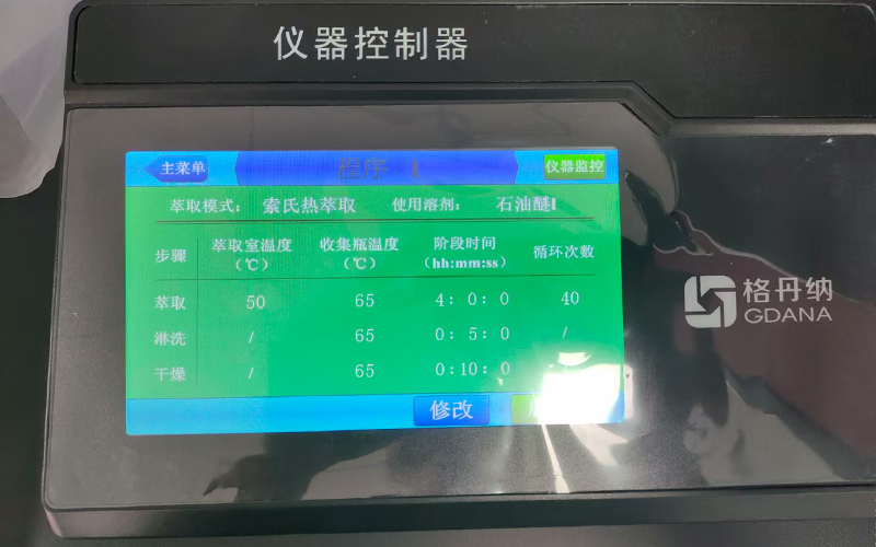 參數(shù)設(shè)置:通過外接控制器的大屏幕界面,演示如何根據(jù)檢測需求選擇萃取方法(如經(jīng)典索氏萃取法、熱萃取法),并設(shè)置加熱溫度、萃取時長等參數(shù),同時講解參數(shù)保存與調(diào)用功能,方便后續(xù)同類樣品檢測;