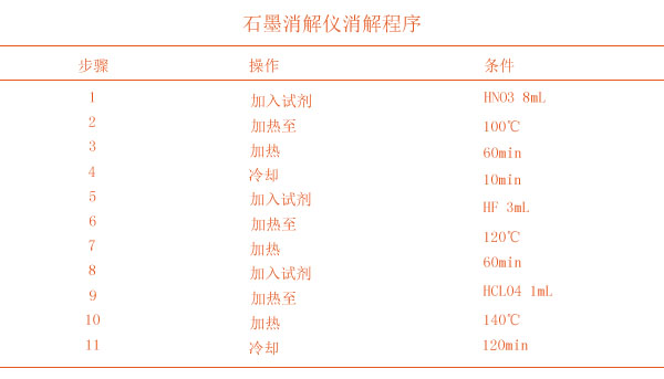 稱取試樣0.2~0.5g(精確到0.1mg)于聚四氟乙烯消解管中,將消解管放入石墨消解裝置石墨孔中。設(shè)置消解程序進行消解。消解完畢后冷卻至室溫,然后加入硝酸溶液(1+1)1mL溶解殘渣,轉(zhuǎn)移至50mL容量瓶中,用少量去離子水洗滌消解罐,洗滌液一并轉(zhuǎn)移至容量瓶,同時測定消解全程空白。智能石墨消解的消解程序下面見表1。
