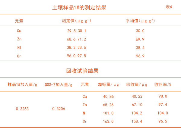 將土壤樣品1#按照消解步驟消解后進行ICP–OES測定。然后將土壤樣品1#與GSS–7質(zhì)控樣以質(zhì)量比1∶1左右進行加標回收試驗,測定結(jié)果見表4。從表中結(jié)出各元素回收率在96.5%~104.0%之間,滿足分析要求。